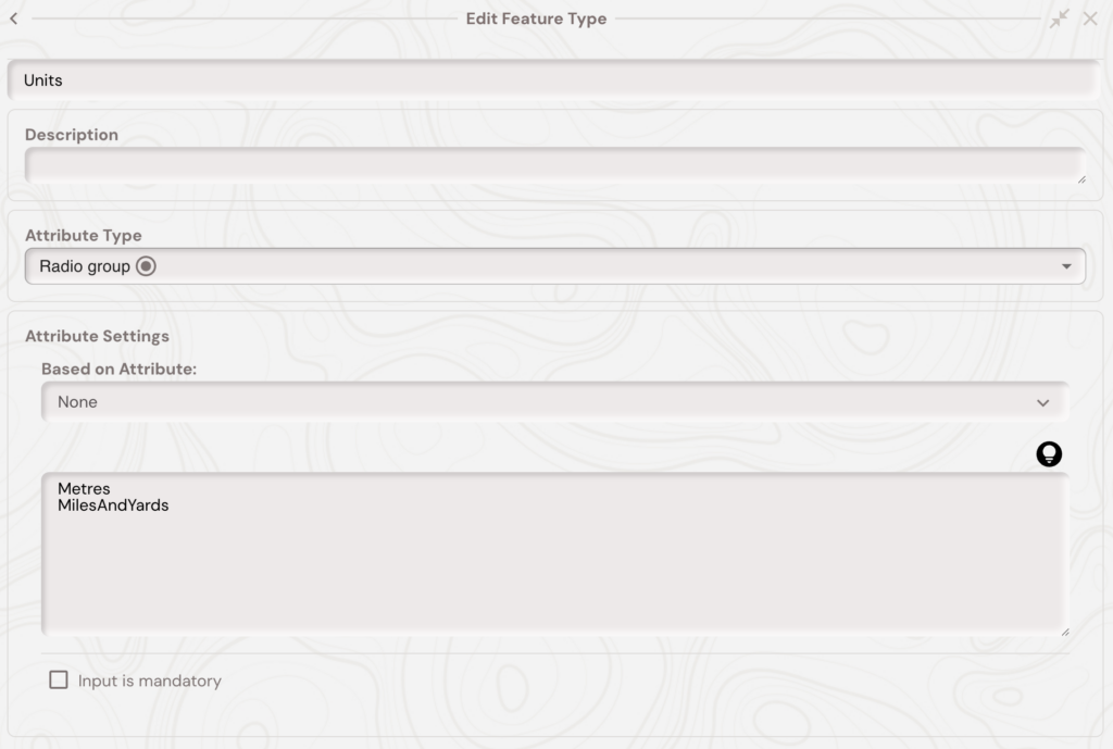 If you want the units of the maps chainage and offset display, chainage markers, and chainage and offset based calculations to be in the ‘miles and yards’ format, e.g 1M 13Y, then you need to add a ‘Units’ attribute to the feature type of the linear feature selected as the alignment. Then set the value of this attribute to ‘MilesAndYards’. You can see in the image below this is setup as a radio group attribute. Metres is the default unit for all chainage and offset displays and calculations.
