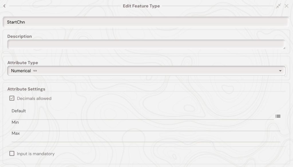 If the linear feature selected as alignment does not start at a chainage value of 0, then you can also specify this by creating a ‘StartChn’ numeric attribute to the feature type of the linear feature selected as the alignment. All chainage and offset calculations, including the UI displays, will then take this into account.