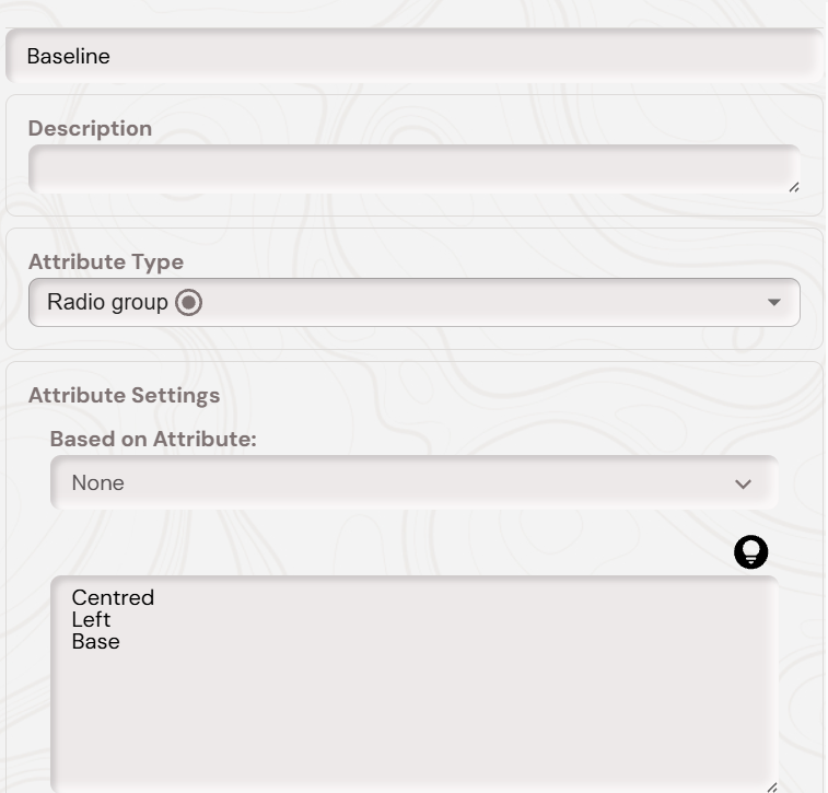 A numerical attribute named ‘Rows’, a numerical attribute named ‘Cols’, and a numerical attribute named ‘Spacing’. It also needs a radio group attribute with the options ‘Centred’, ‘Left’, ‘Base’ for the baseline, as shown below:
